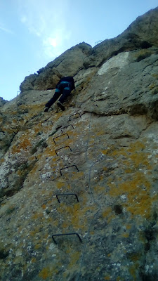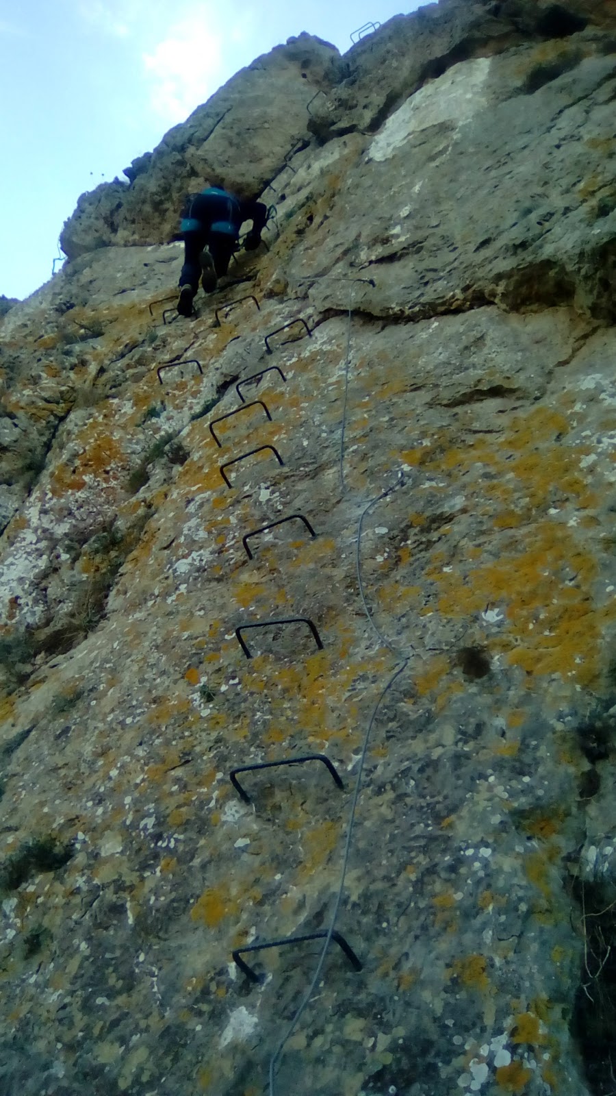 Como podéis ver en las imágenes, no supone ninguna dificultad. Los peldaños están muy juntos y aunque tiene cierta verticalidad, se deja subir facilmente. Si acaso, lo único a lo que se le puede poner una pega, es que las 15 primeras grapas suben desviándose ligeramente a la izquierda, lo que provoca que el peso del cuerpo nos venza, pero vamos… nada reseñable.