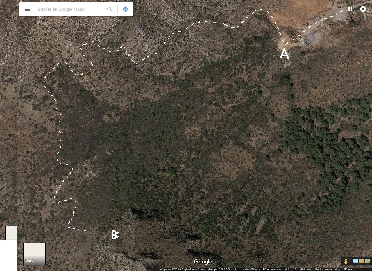 Siguiendo por ahí, llegaremos a un punto en el que no sabremos por donde seguir… Y nuestra intuición nos dirá que sigamos avanzando en dirección al cabezo, pero realmente debemos mirar a la derecha, hacia un pequeña ladera que sube y por veremos el primer montón de piedras que señaliza el camino de ascenso. Como nosotros nos perdimos la primera vez que fuimos, voy a poner un mapa con el camino marcado para que no tengáis el mismo problema.