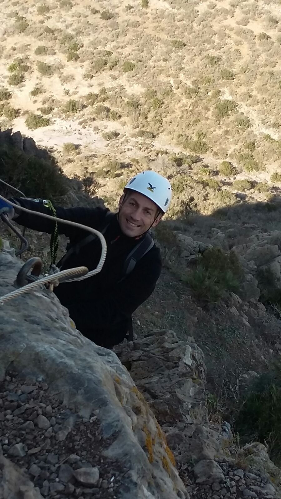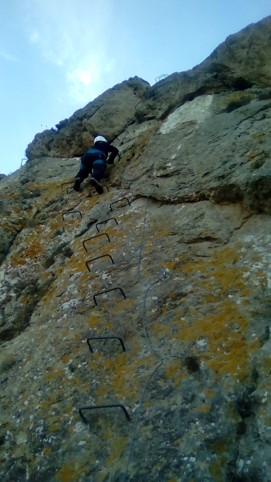 La ferrata Cabezo La Popuz es muy curiosa… El inicio es bajando, en vez de subiendo… y podéis llegar a pensar que os habéis equivocado, pero un poco mas adelante encontrareis el primer tramo de ascenso y podréis respirar aliviados. Como detalles, tiene un curioso punte fabricado con un tronco de madera que cruzar.